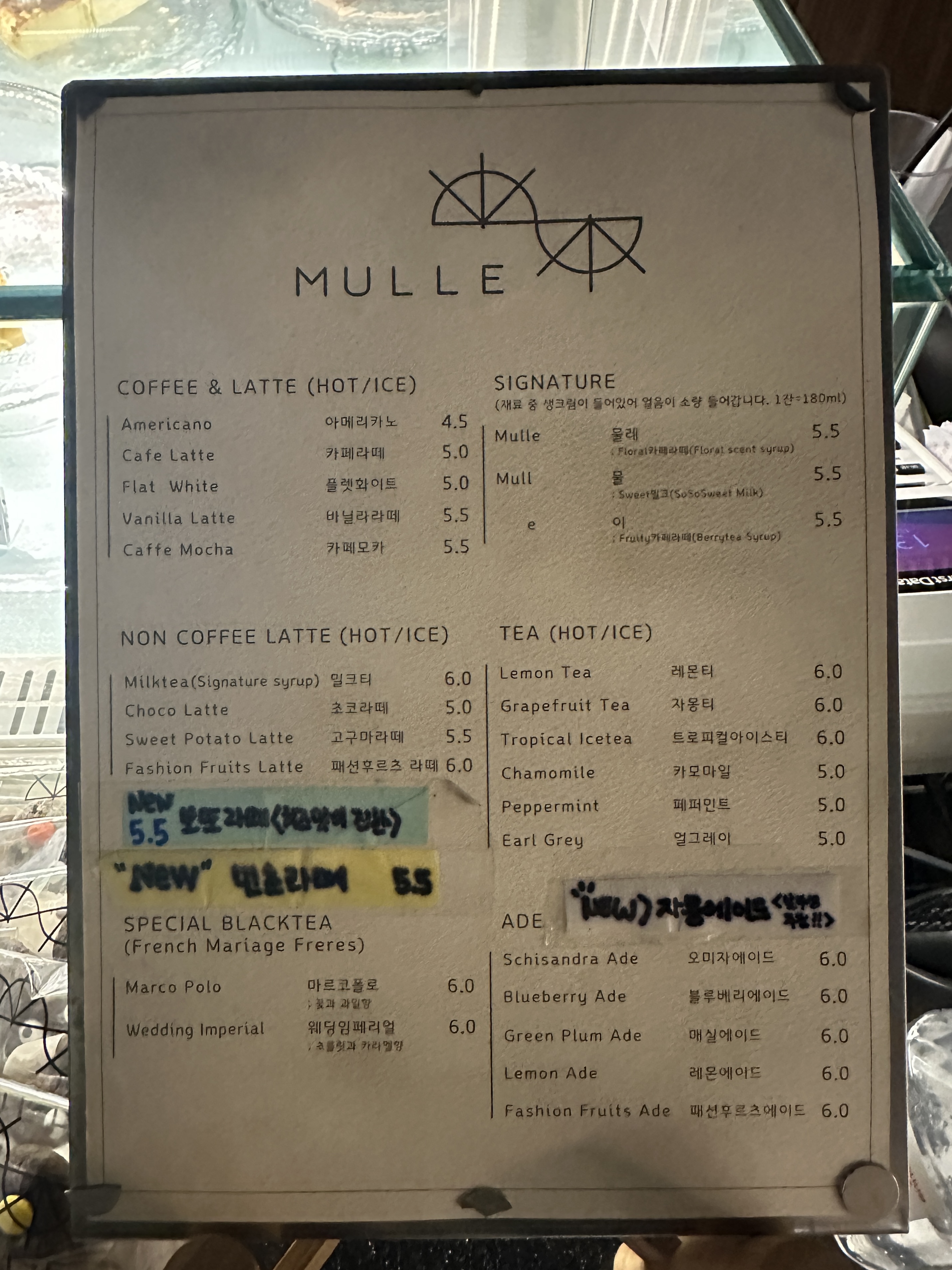 카페 물레의 메뉴판이예요.