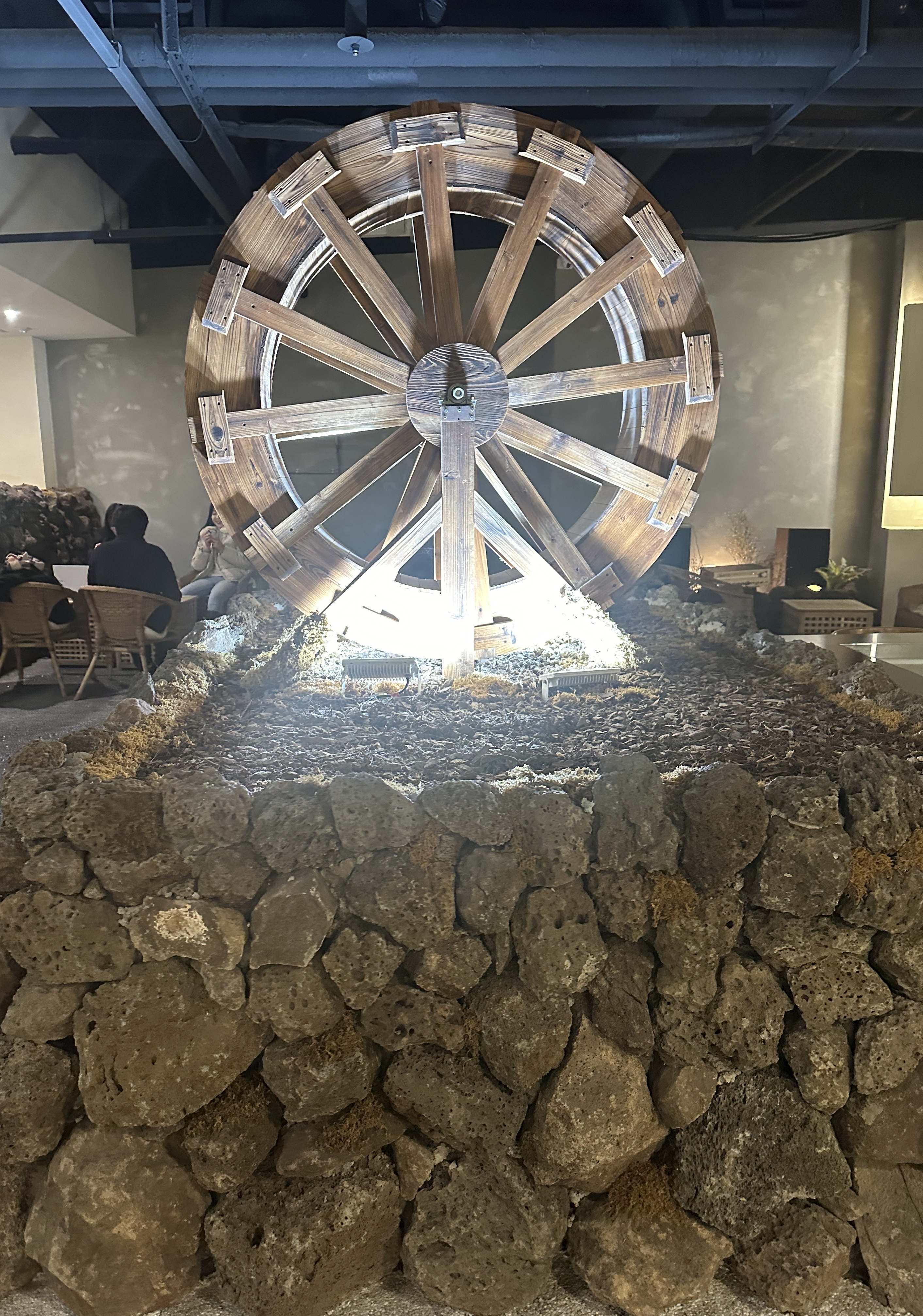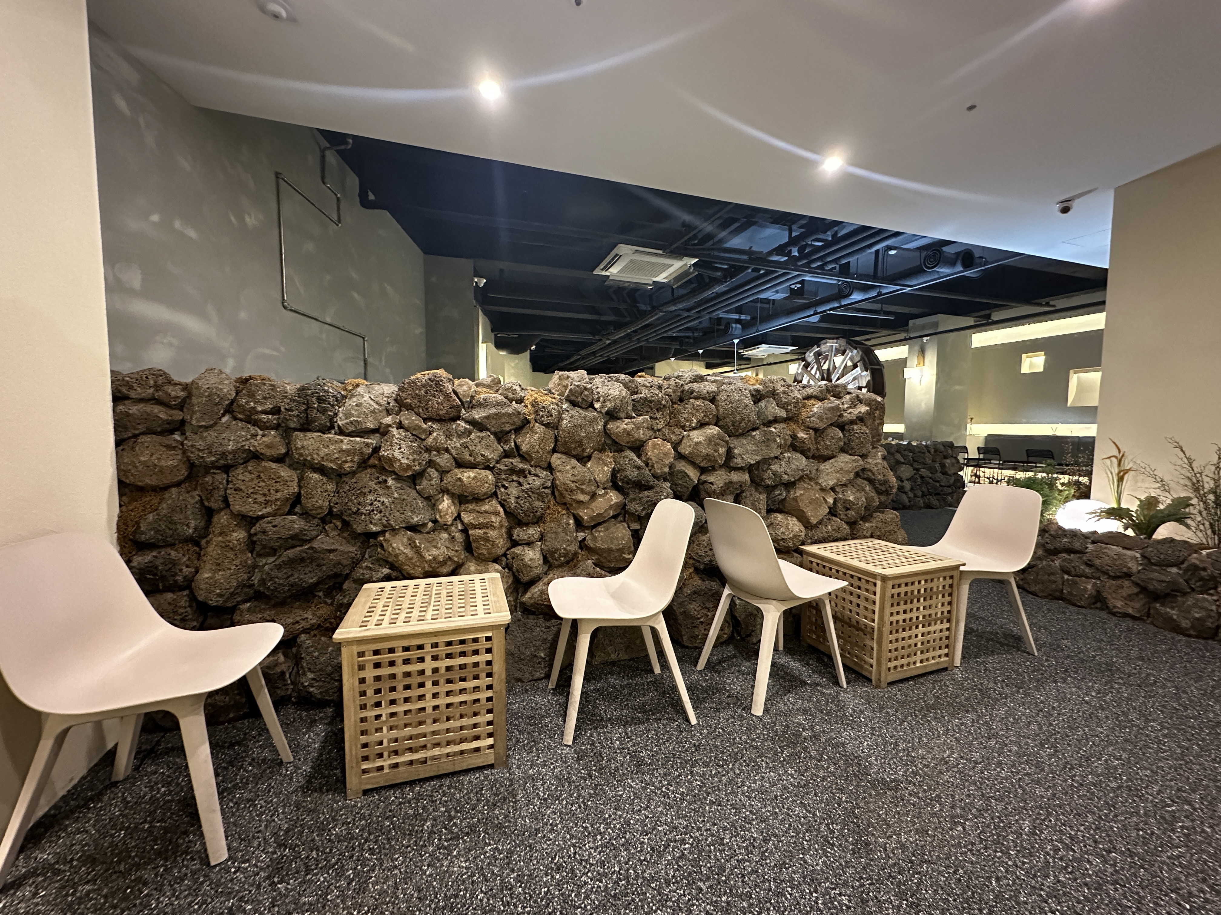 지하1층으로 내려가면 물레 로고와 돌담 장식이 보입니다.