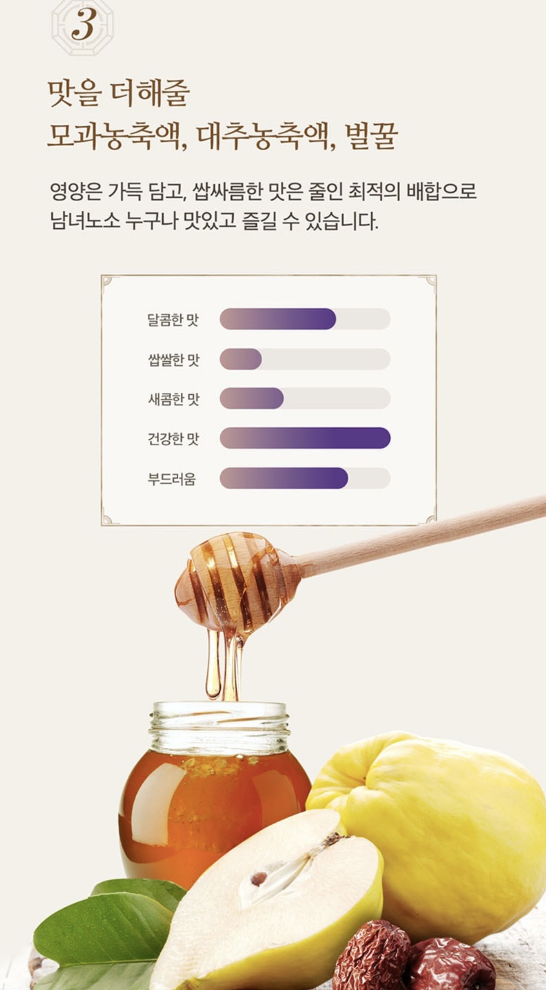 모과농축액+대추농축액+벌꿀이 들어가서 달큰한 맛이 나고, 쓴맛은 느껴지지 않아요.