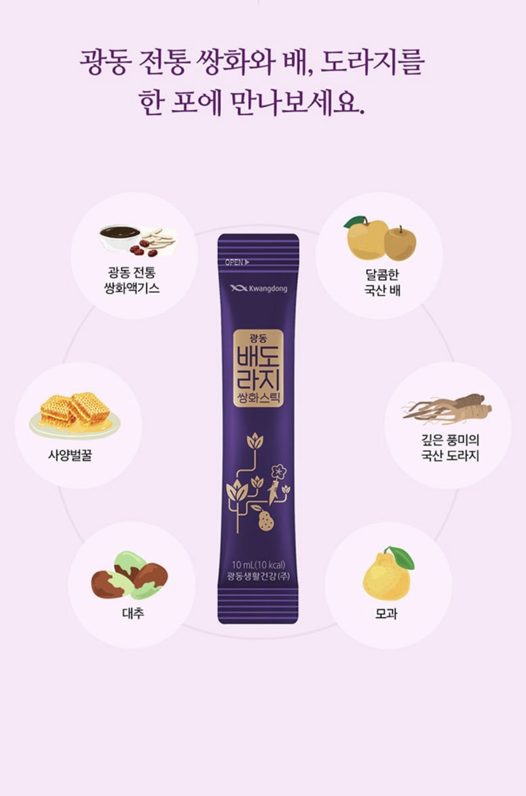10ml 한 포 안에 배+도라지+모과+대추+사양벌꿀+쌍화액기스가 함유되어 있습니다.